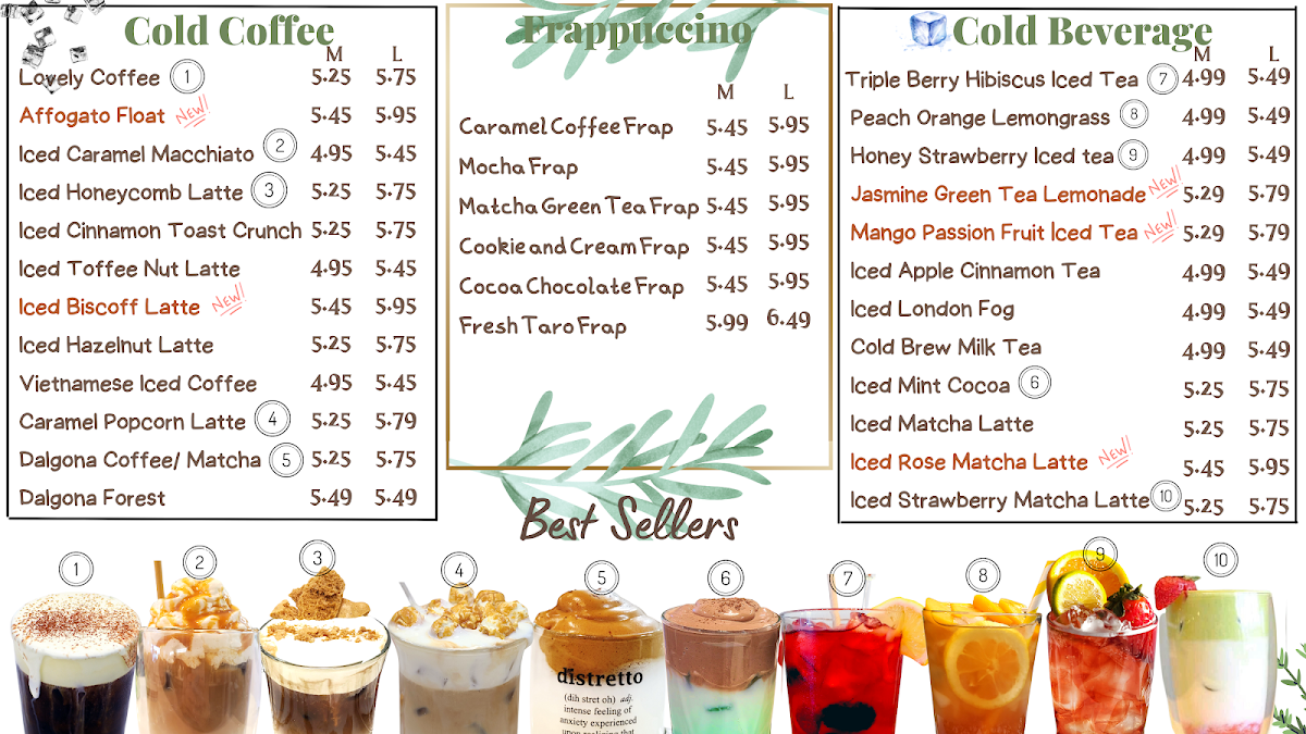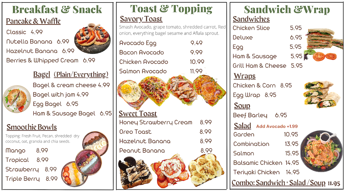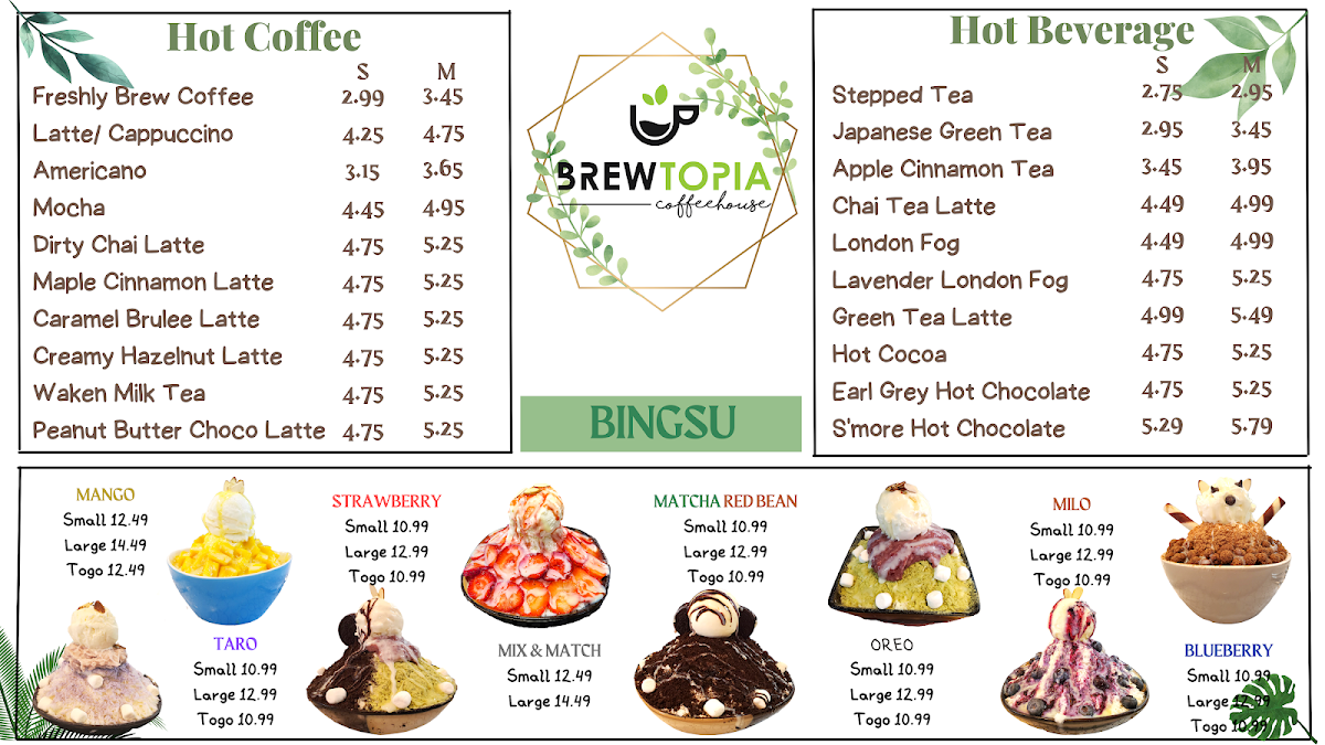 Brewtopia Coffeehouse offers a diverse and tempting menu that caters to a wide range of tastes. For dessert lovers, they have options like Cakes, Smoothie Bowls, and Mini TreatsSweet Toast. Their bakery section features freshly baked items such as Milk Bread, Soft Donut (Vanilla Cream), Bacon Onion Bun, Pistachio Croissant, and Butter Croissant. Hot coffee enthusiasts can enjoy drinks like Americano, Mocha, Peppermint Latte, Maple Cinnamon Latte, and the popular Dirty Chai Latte. The hot beverage section also includes comforting options like Pumpkin Chai Latte, S'more Hot Chocolate, and Lavender London Fog. If you’re in the mood for something more seasonal, they offer delightful drinks such as the UBE Coffee Latte (20oz), PISTACHIO Milk Tea, and the PISTACHIO Frappe. For those looking for a refreshing treat, their Bubble Tea selection features options like Classic Bubble Tea, Brown Sugar Fresh Milk Brulee, and Pistachio Milk Tea. If frappes are your thing, there are choices like Pumpkin Spice Frapp, Taro Frapp, and Caramel Frapp. The cold beverages section includes drinks such as Iced Cocoa, Salted Caramel Matcha Latte, and Peach Matcha Latte, while the Bingsu selection offers indulgent flavors like Taro Bingsu, Blueberry Bingsu, and Strawberry Bingsu. Cold coffee fans will enjoy the variety of iced drinks, including the Iced Biscoff Latte, Iced Mocha, and Iced Honeycomb Latte. Whether you’re looking for a cozy hot drink, a refreshing iced beverage, or a sweet treat, Brewtopia Coffeehouse has something to satisfy every craving.
